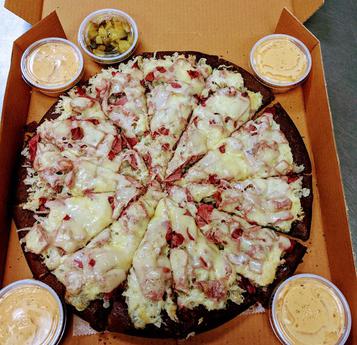 3/4 LB. Corned beef , sauerkraut and Swiss cheese spread over a pumpernickel crust. Served with Thousand island dressing and diced pickles. Only available in Large $28.99